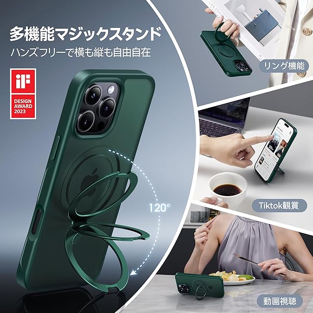 【8年間の技術結晶!4in1超万能モデル】CASEKOO iPhone 16 Pro 用 ケース 米軍MIL規格 横縦両立 指紋防止 マット仕上げ 最大25W急速充電対応 MagSafe対応 黄変防止 半透明 ストラップホール付き ワイヤレス充電対応 いphone16pro 用ケース 6.3インチ「MagicStand」(グリーン)
