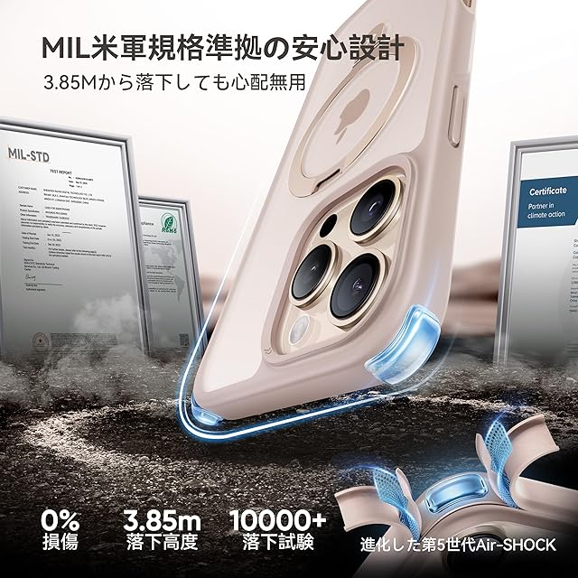 MIL米軍規格取得・驚異の防御!】業界高レベルの硬度と耐衝撃度を実現。3.85Mから落下させてもスマホ本体は綺麗に無傷!過酷な米国国防総省の耐衝撃試験「MIL-STD-810G」認証クリアし、特別な振動低減技術と三重耐衝撃構造、ケースの四隅に進化された第5世代AIR‐SHOCHを搭載することにより、衝撃吸収性能を20倍アップ!どのような角度の衝撃に対しても受け止めて大切なスマホをしっかりと保護!また、側面にだけの滑り止め設計により、ホールド感が高まり、春から夏にかけて手汗が濡らしても滑りにくい。米軍MIL認証番号:GZMR240702237705|認証機関:CSTC Standards Testing Center | 認証時間:Jul 20, 2024