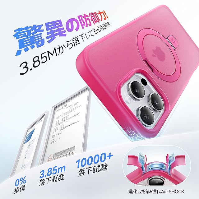【MIL米軍規格取得・驚異の防御!】業界高レベルの硬度と耐衝撃度を実現。3.85Mから落下させてもスマホ本体は綺麗に無傷!過酷な米国国防総省の耐衝撃試験「MIL-STD-810G」認証クリアし、特別な振動低減技術と三重耐衝撃構造、ケースの四隅に進化された第5世代AIR‐SHOCHを搭載することにより、衝撃吸収性能を20倍アップ!どのような角度の衝撃に対しても受け止めて大切なスマホをしっかりと保護!また、側面にだけの滑り止め設計により、ホールド感が高まり、春から夏にかけて手汗が濡らしても滑りにくい。米軍MIL認証番号:GZMR240702237705|認証機関:CSTC Standards Testing Center | 認証時間:Jul 20, 2024