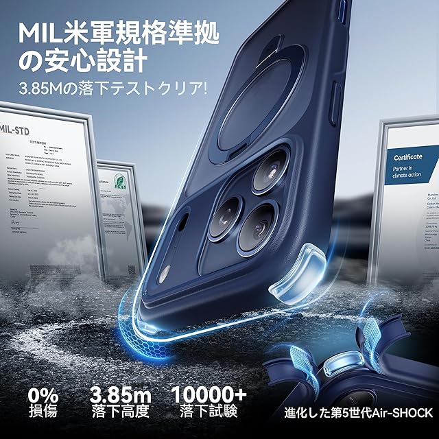 【MIL米軍規格取得・薄型でも強力な防護】この保護ケースは、薄型で軽量ながら、業界最高レベルの耐久性と耐衝撃性を誇ります!CASEKOO独自設計のスマホケースは、常にユーザー目線を重視。高品質な素材(PC+TPC)を使用し、特殊な衝撃吸収技術と三層構造を組み合わせることで、薄型でありながらもしっかりとした保護力を実現しています。ケースの四隅には最新の第5世代AIR-SHOCK技術を採用し、最大3.85メートルの落下衝撃に耐えられます。その衝撃吸収性能は従来のスマホケースの20倍で、落下時でもスマホを安全に守ります。さらに、米国MIL-STD-810G耐衝撃テストを余裕でクリア。軍規格レベルの防護で、スマホの安全性をより一層確保します。ケースの縁は高さを持たせた包み込み設計で、あらゆる角度から大切なスマホを全面的に保護し、どの角度からの衝撃も防ぎます 米軍MIL認証番号:GZMR240702237705|認証機関:CSTC Standards Testing Center | 認証時間:Jul 20, 2024