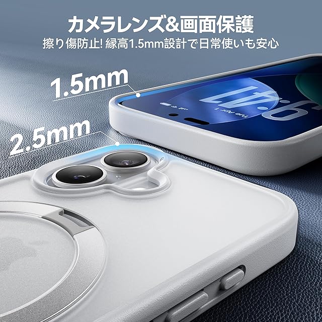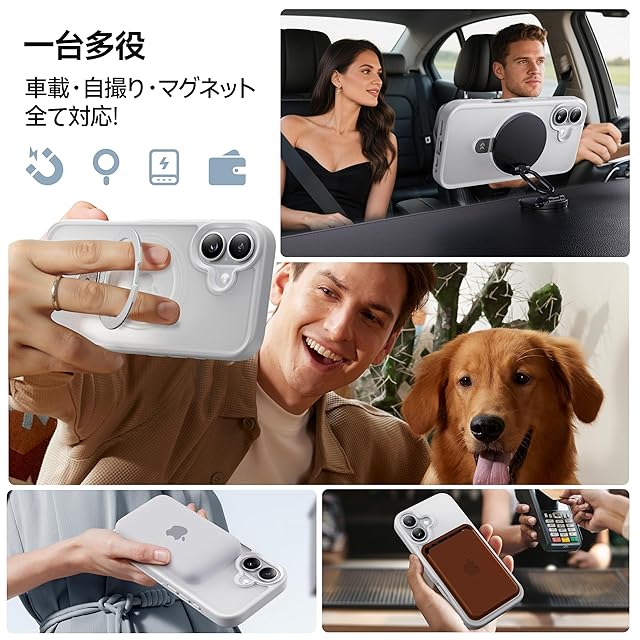 【スゴすぎる!多機能スタンド】MagicStandシリーズのケースは、横向き・縦向き両方で使用可能なスタンド機能を備え、MagSafe対応の無損充電にも対応しています。リング型デザイン、持ち運びも簡単です。スタンド機能は角度調整が自由にできるため、日常のドラマ視聴、動画閲覧、オンライン会議、セルフィー撮影など、さまざまなシーンに対応します。スタンドは強化ヒンジ構造と航空機用アルミ合金素材で設計されており、開閉はスムーズで変形や破損しにくく、45,000回以上の開閉テストでも安定性は変わりません。耐久性は従来のスタンドの約10倍。どんなシーンでもスマホをしっかり支え、日常生活で両手を完全に解放し、快適で便利な使い心地をお楽しみいただけます