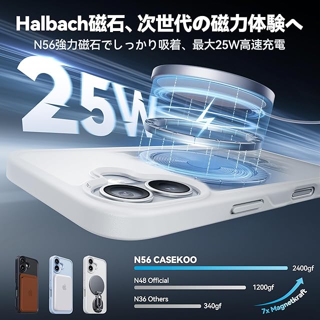 【最大25Wの高速充電&強力な磁力対応】CASEKOOOは独自の非閉合メタルリング設計を採用しており、充電効率の損失を減らし、発熱を抑えます。さらに、Halbachアレイ磁気吸着技術を組み合わせることで、充電中のスマートフォンへの影響を最小限に抑え、最大25Wの高速ワイヤレス充電をほぼエネルギー損失なく実現します。また、業界最強のN56磁石を使用しており、従来の保護ケースに使われる磁石の20倍の吸着力を持ちます。でこぼこの道でも、MagSafe対応の車載ホルダーにしっかりと接続でき、脱落の心配なく安心して使用できます。さらに、両面磁吸設計により、冷蔵庫や壁、キッチンなどの鉄製面にも安定して吸着可能。料理中、運動中、休憩中でも、両手を自由に使いながら動画視聴や通話を楽しめます 対応モデル:for iPhone17 ケース