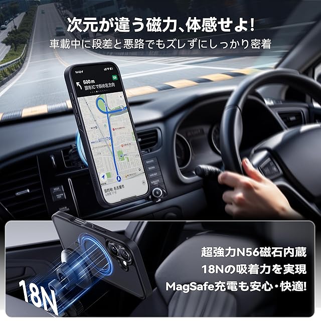 【超強磁力&最大25W高速充電対応】市販で装着するとワイヤレス充電できないとは異なり、弊社独自のHalbach配列磁界閉鎖技術により、端末への影響がなくスマホのワイヤレス充電機能に干渉がなく、最大25W高速ワイヤレス充電ができ、業界最強なN56磁石で吸着力は従来より20倍も高くなり、MagSafe対応の車載ホルダーに装着した状態で、悪路の走行中でも落下の心配もなく快適です!また両面式マグネットを採用しており、冷蔵庫、壁、キチンなど鉄ある所に、貼り付けたのまま動画視聴も可能です。対応機種:いPhone16ケース
