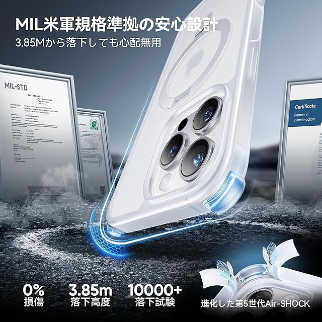 【MIL米軍規格取得・驚異の防御!】業界高レベルの硬度と耐衝撃度を実現。3.85Mから落下させてもスマホ本体は綺麗に無傷!過酷な米国国防総省の耐衝撃試験「MIL-STD-810G」認証クリアし、特別な振動低減技術と三重耐衝撃構造、ケースの四隅に進化された第5世代AIR‐SHOCHを搭載することにより、衝撃吸収性能を20倍アップ!どのような角度の衝撃に対しても受け止めて大切なスマホをしっかりと保護!また、側面にだけの滑り止め設計により、ホールド感が高まり、春から夏にかけて手汗が濡らしても滑りにくい。米軍MIL認証番号:GZMR240702237705|認証機関:CSTC Standards Testing Center | 認証時間:Jul 20, 2024