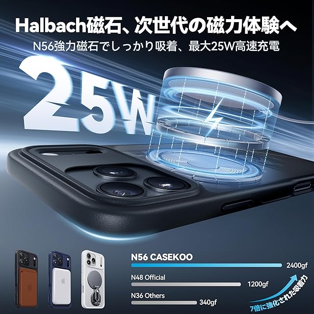【最大25Wの高速充電&強力な磁力対応】CASEKOOOは独自の非閉合メタルリング設計を採用しており、充電効率の損失を減らし、発熱を抑えます。さらに、Halbachアレイ磁気吸着技術を組み合わせることで、充電中のスマートフォンへの影響を最小限に抑え、最大25Wの高速ワイヤレス充電をほぼエネルギー損失なく実現します。また、業界最強のN56磁石を使用しており、従来の保護ケースに使われる磁石の20倍の吸着力を持ちます。でこぼこの道でも、MagSafe対応の車載ホルダーにしっかりと接続でき、脱落の心配なく安心して使用できます。さらに、両面磁吸設計により、冷蔵庫や壁、キッチンなどの鉄製面にも安定して吸着可能。料理中、運動中、休憩中でも、両手を自由に使いながら動画視聴や通話を楽しめます 対応モデル:iPhone17ProMax 用ケース