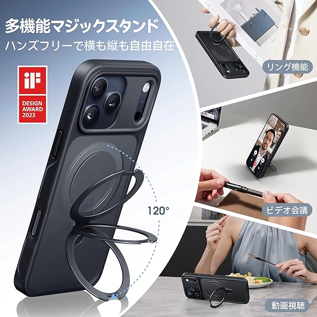 【スゴすぎる!多機能スタンド】iphone 17 pro ケース 対応 MagicStandシリーズのケースは、横向き・縦向き両方で使用可能なスタンド機能を備え、MagSafe対応の無損充電にも対応しています。リング型デザイン、持ち運びも簡単です。スタンド機能は角度調整が自由にできるため、日常のドラマ視聴、動画閲覧、オンライン会議、セルフィー撮影など、さまざまなシーンに対応します。スタンドは強化ヒンジ構造と航空機用アルミ合金素材で設計されており、開閉はスムーズで変形や破損しにくく、45,000回以上の開閉テストでも安定性は変わりません。耐久性は従来のスタンドの約10倍。どんなシーンでもスマホをしっかり支え、日常生活で両手を完全に解放し、快適で便利な使い心地をお楽しみいただけます