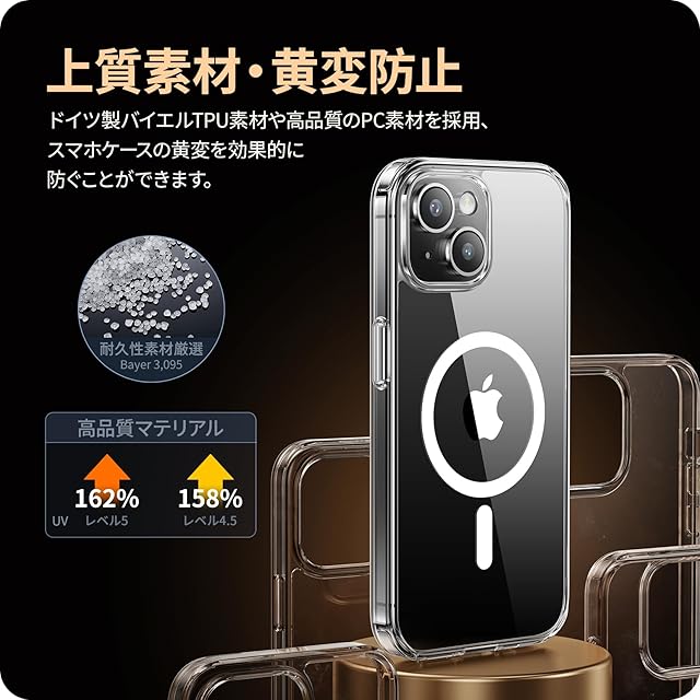 【驚くほどの透明度・黄変防止強化】背面は高透明度ポリカーボネートの素材で、スマホ本来の崇高な美しさと色をそのままに生かし、スマホ本体の高級感にも劣らない美しさです。ドイツ製バイエルTPU素材や高品質のPC素材を採用、TPU高分子にUV剤を添加し、黄変防止レベルは4.5級を獲得。スマホを長時間使用しても光沢感、透明感を保つことができます!