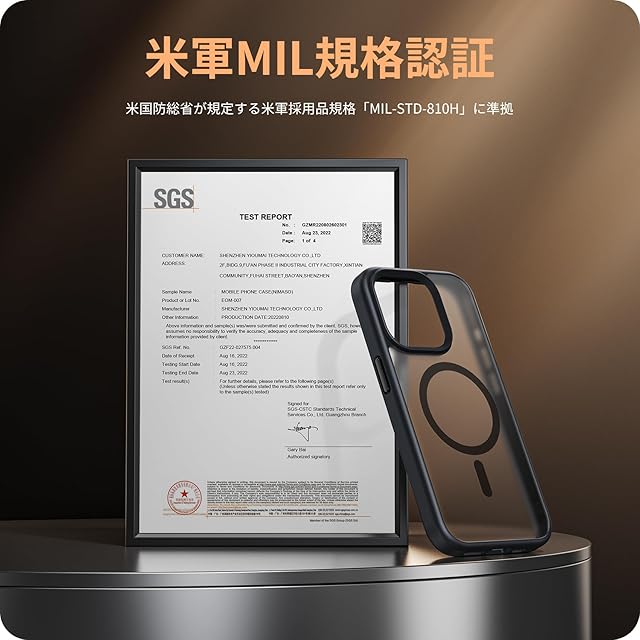 【米国MIL規格取得・耐衝撃】世界で有名な世界で有名な米国防総省が規定する米軍採用品規格「MIL-STD-810H」認証を取得済みです(認証番号:GZMR220802602301)。1.22mの高さからコンクリートの地面に厚さ5mmの合板を敷き、それぞれ違う角度から合計26回落下させても、本体は無傷です。高い耐衝撃性を誇り、iphone15 ProMaxを全方位からしっかりと守ります。