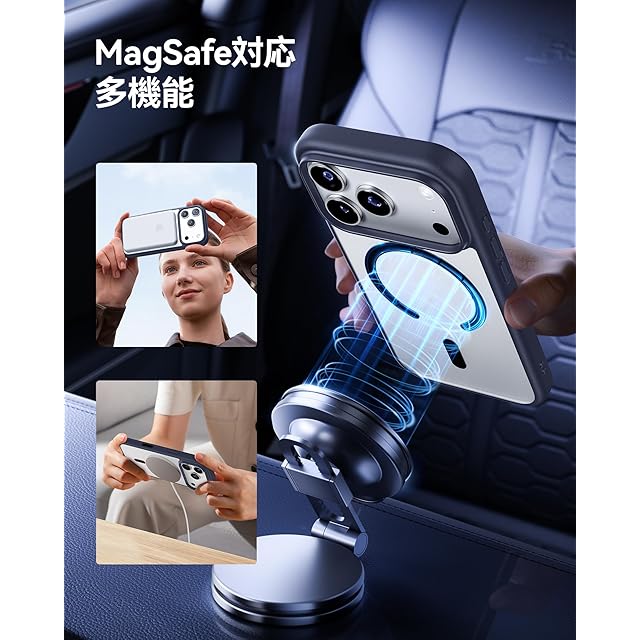 【強力な磁力吸着・高速充電】強力なマグネットが内蔵されており、差し込みのいらない超簡単充電を実現。マグネット部分は位置が正確に合致しており、ワイヤレス充電がこれまでよりもすばやく簡単に完了します。あいふぉん17 Proを充電する時は、ケースを装着したままMagSafe充電器に取り付けるか、Qi規格の充電器の上に置くだけです。