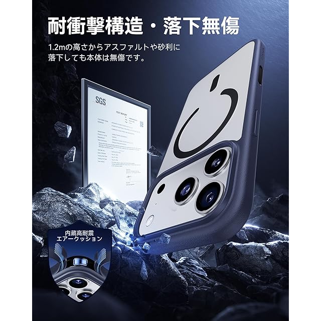 【米軍規格SGS認証・超強耐衝撃性】世界で有名な米国防総省が規定する米軍採用品規格「MIL-STD-810H」認証を取得済み(認証番号:GZMR220802602301)。ケースの縁はiPhoneの液晶画面より1mm、カメラレンズより1.2mm高く、ガラスフィルムを貼り付けた状態で平置きしても画面は接触せず保護をします。コンクリート地面に厚さ5mmの合板を敷き、高さ1.2mから合計26回、様々な角度から落下させる実験をしたところ、本体に傷はつきませんでした。高い耐衝撃性を誇り、本体を全方位からしっかりと守ります。