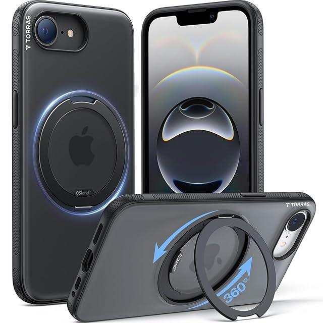 TORRAS iPhone 16e 用 ケース【動画視聴ベストケース】多機能一体360°回転スタンド 2025 半透明 耐衝撃 マット感 黄ばみなし レンズ保護 ストラップホール付き magsafe対応 ワイヤレス充電対応 iphone 16e 用カバー ドット模様 6.1インチ「Ostand O3 Fitness」ミッドナイト(マットブラック)