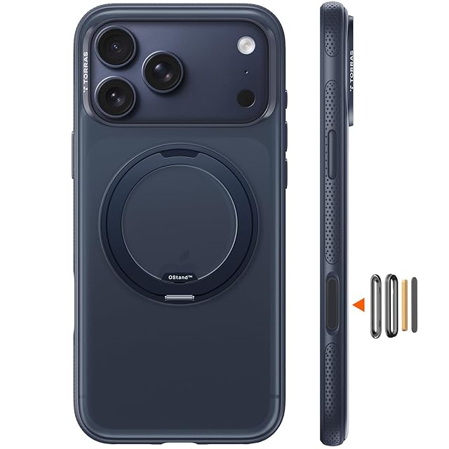 TORRAS iPhone 17 Pro 用ケース 【カチカチ・多機能360度回転スタンド】リング Ostand O3 Fitness MagSafe対応 米軍MIL規格耐衝撃 スタンド 指紋防止 黄変防止 カメラコントロールボタン付き ストラップホール 半透明 撮影/動画視聴/日常の記録 手のひらサイズの映像革命 ブルー