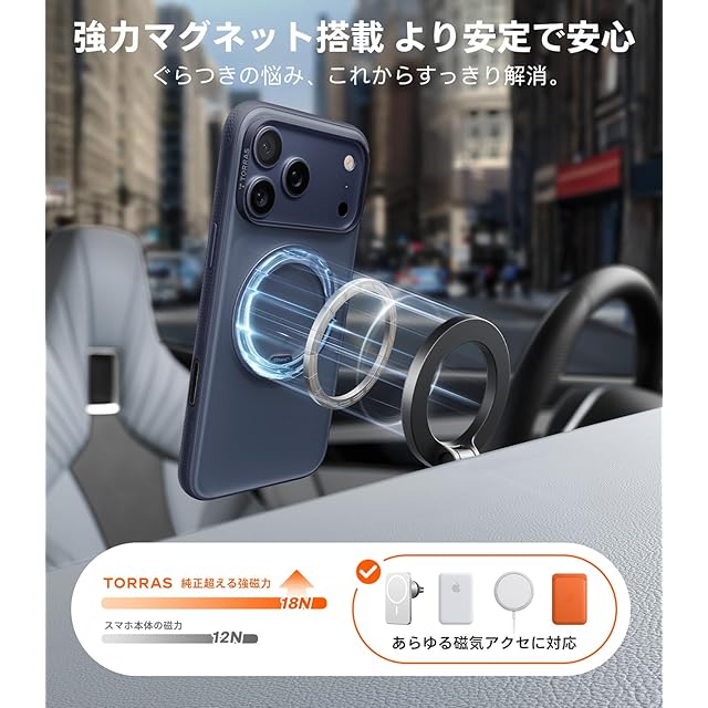 【驚異の磁力MAX!】36個の高性能N52磁石を採用し、純正MagSafeと同素材で作られています。さらに独自特許のHalbach Array技術により磁石の配置と磁力線の方向を最適化し、純正を超える吸着力を実現。スマホをしっかり固定するだけでなく、ワイヤレス充電効率も大幅アップします。対応機種:For iPhone 17 pro ケース