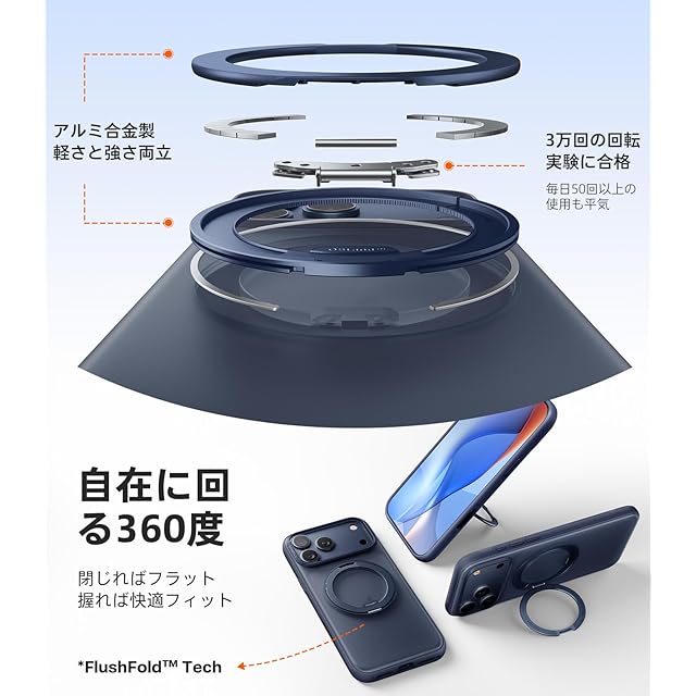 【 自由自在の360°回転スタンド】360°回転可能な支架を搭載し、いつでも自由に角度調整が可能。新設計の滑らかな阻尼感と心地よいカチカチ音で、開閉するたびにリラックス感と楽しさを実感できます。撮影、動画視聴、日常の記録など、あらゆるシーンで、お好みの角度に自由に調整してしっかり固定でき、手を解放して快適に操作が楽しめます。対応機種:For iPhone 17 pro ケース
