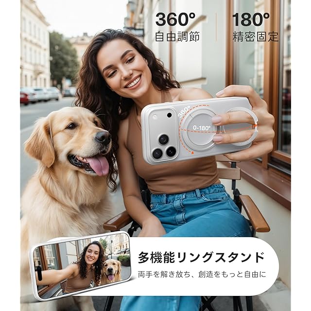 【 自由自在の360°回転スタンド】360°回転可能な支架を搭載し、いつでも自由に角度調整が可能。新設計の滑らかな阻尼感と心地よいカチカチ音で、開閉するたびにリラックス感と楽しさを実感できます。撮影、動画視聴、日常の記録など、あらゆるシーンで、お好みの角度に自由に調整してしっかり固定でき、手を解放して快適に操作が楽しめます。対応機種:For iPhone 17 pro ケース