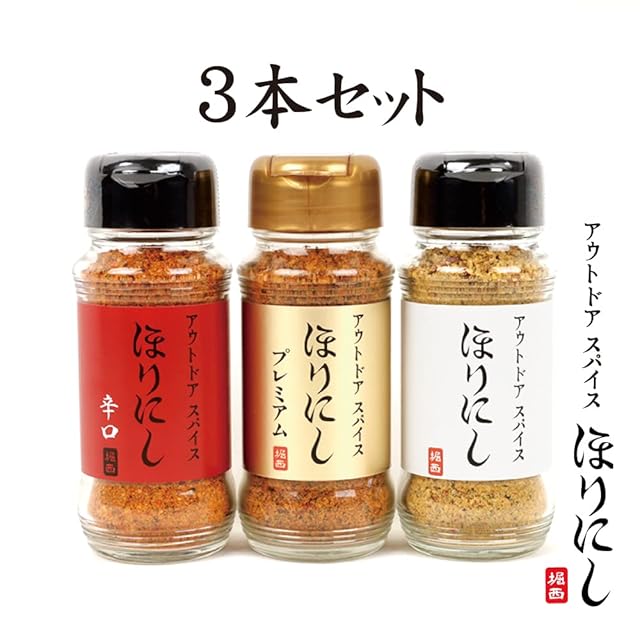アウトドアスパイス「ほりにし」と「ほりにし辛口」「ほりにしプレミアム」の3本セット