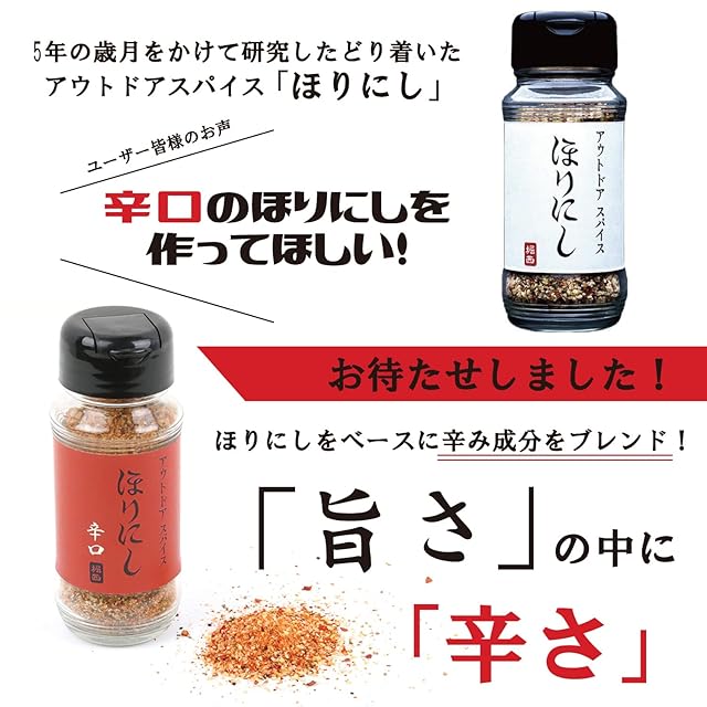 アウトドアスパイス「ほりにし」2本と「ほりにし辛口」1本の3本セット <br> 原材料・成分<br> ★ほりにし★ <br> 【原材料名】 食塩(国内製造、アメリカ製造、ドイツ製造)、ガーリック、黒コショウ、粉末醤油、赤唐辛子、レッドベルペパー、陳皮、コリアンダー、ミルポアパウダー、植物油脂、チキン調味料、パセリ、パプリカ、オニオン、ジンジャー、バジル、オレガノ、マジョラム、ローズマリー、ローレル、セロリーシード/調味料(アミノ酸等)、リン酸Ca、(一部に小麦、大豆、鶏肉、豚肉を含む) <br> <br> 【内容量】 100g(1本)<br> <br> ★ほりにし辛口★ <br> 【原材料名】 食塩(アメリカ製造、国内製造)、赤唐辛子、ガーリック、黒コショウ、陳皮、砂糖、ミルポワパウダー、オニオン、酵母エキス、粉末醤油、パプリカ、チキン調味料、植物油脂、パセリ、青唐辛子、ジンジャー、コリアンダー、バジル、オレガノ、マジョラム、ローズマリー、山椒、ローレル/調味料(アミノ酸等)、リン酸Ca、(一部に小麦・大豆・鶏肉・豚肉を含む)<br> <br> 【内容量】90g(1本)<br> <br> 【保存方法】直射日光、高温多湿を避けて保存してください。<br> 光や日光に長時間当てていると変色の原因となります。(品質には問題ありません)<br> 保管時はなるべく高温多湿を避け、温度差が少なく風通しの良い冷暗所での保管を推奨いたします。
