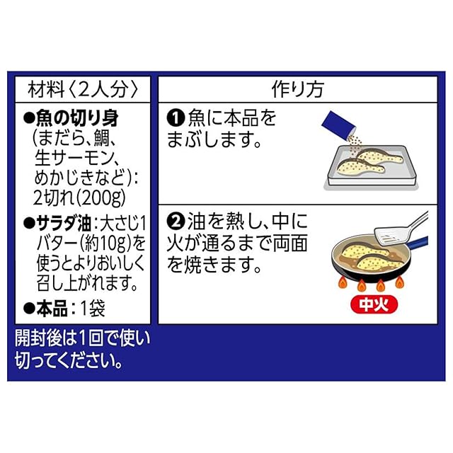 原材料:食塩、コーングリッツ、ブラックペパー、ガーリックパウダー、ディル、粉末レモン果汁、パセリ、イタリアンパセリ、カルダモン、粉末しょう油、タイム/加工デンプン、調味料(アミノ酸等)、酸味料、ショ糖エステル、炭酸Ca、香料、(一部に小麦・大豆を含む)