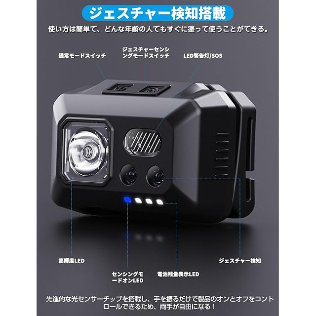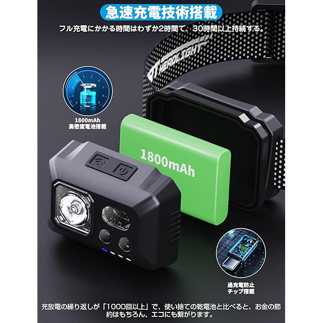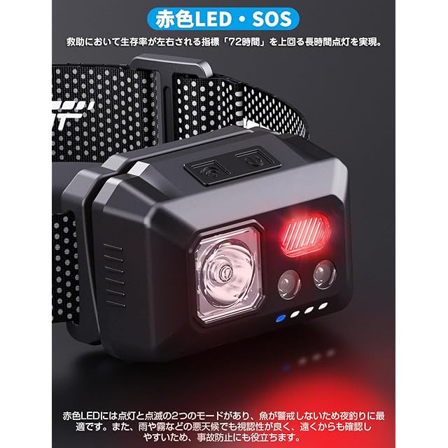 商品名:Tebool ヘッドライト Type-C充電式 大容量1800mAh 高輝度 LED 1000ルーメン 手振りセンサー機能付き 5種点灯モード 赤&白ライト SOS点滅 頭につけ ヘッドランプ 防水防塵 60°角度調整可 夜釣り 最適 登山 キャンプ 散歩 作業 釣り アウトドア 災害 停電用 小型 超軽量 ヘッド ライト