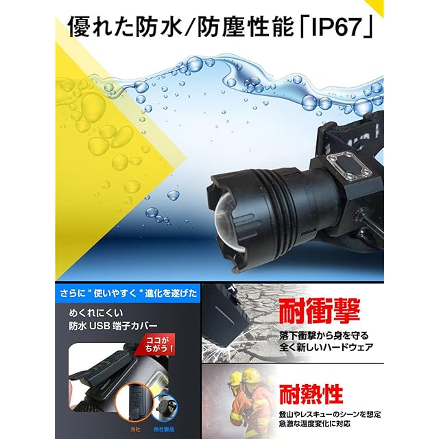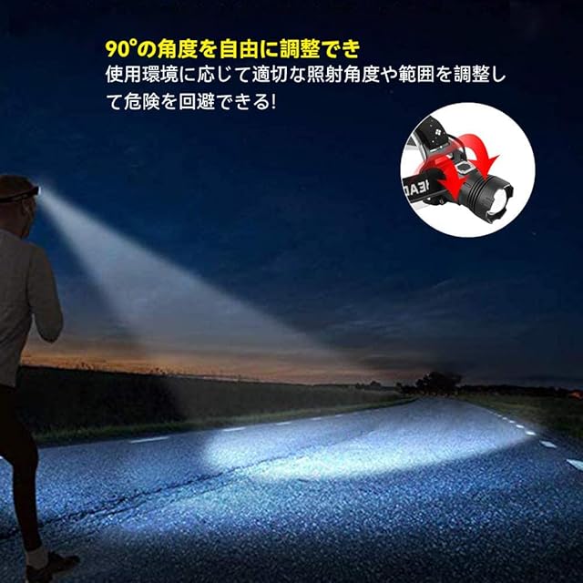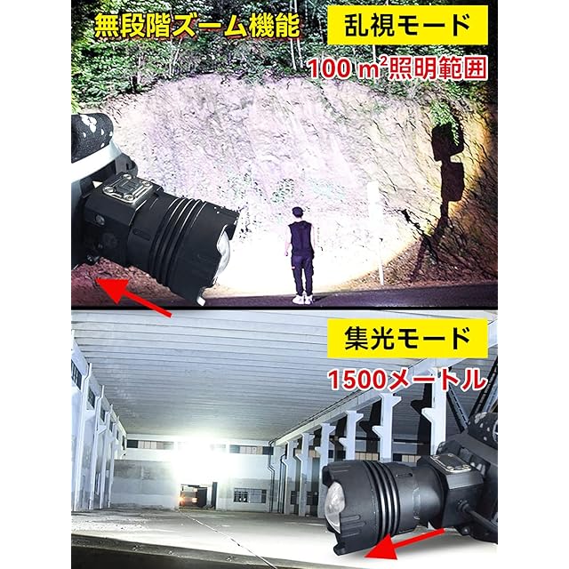 【IPX67防水+5点灯モード+ズーム機能付き+多様な使用方法】 IPX67防水グレードは、5つの点灯モード(強、中、弱 、点滅、SOS)がありますので、スイッチを押すごとに適切なライトモードを選択して、簡単にモードを切り替えます!任意のモードでスイッチを長押しすると、2秒でヘッドランプを直接オフにできます,ランプヘッドを伸縮して、焦点距離を変更します。光斑サイズ、光照射の距離(照明距離:1500メートル)と明るさを勝手に調節して。危険な作業には、ヘッドライトをヘルメットに取り付けることができます。 キャンプ、夜釣り、自転車ライト、登山、停電、防災、地震対策、車のメンテナンス、読書、その他の家庭用照明で広く使用されています。