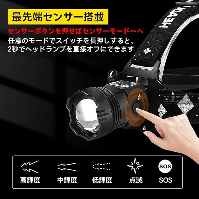 商品名:LED ヘッドライト 実用点灯35時間 3000000ルーメン 超高輝度 Type-C 充電式 ヘッドランプ 5点灯モード 手振りセンサー機能付き 残量表示機能 ズーム機能 90°角度調節可能 軽量 防水防塵 大容量 6600mAh (PSE認証電池2200mAh*3 18650付属) 夜釣り 登山 キャンプ 散歩 作業 釣り アウトドア 災害 停電用