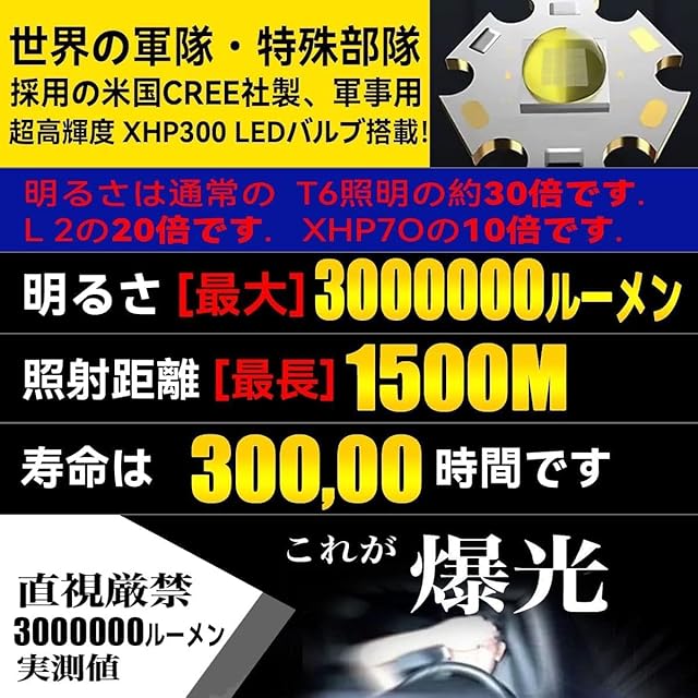 【超高輝度 XHP300 LED ヘッドランプ &軽量】最強の輝度は3000000ルーメンです.(絶対目で直視しないでください!)明るさは通常のT6照明の約30倍です。L2の20倍です、P70の10倍です.照射距離は遠くて夜間に1500メートル以内の物体に焦点を合わせることができます。(縮小すると、光と影は9宮格の正方形の模様になる)、寿命は300,000時間です。大型レンズを採用し、絞りが大きく照射距離が遠い。充電で繰り返し使用でき、電池切り替えの手間が不要で、経済的です。この明るさなら夜の散歩や暗い場所での活動に大活躍。地震、災害や突然停電した時にも役立ちます。