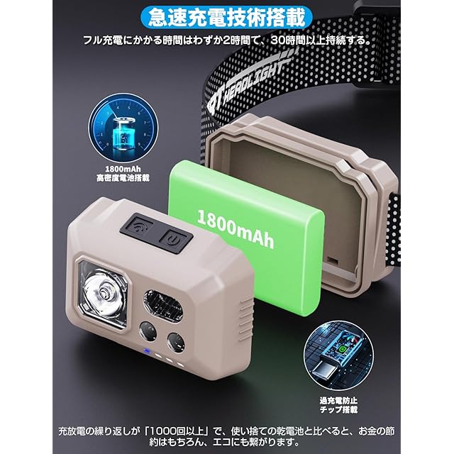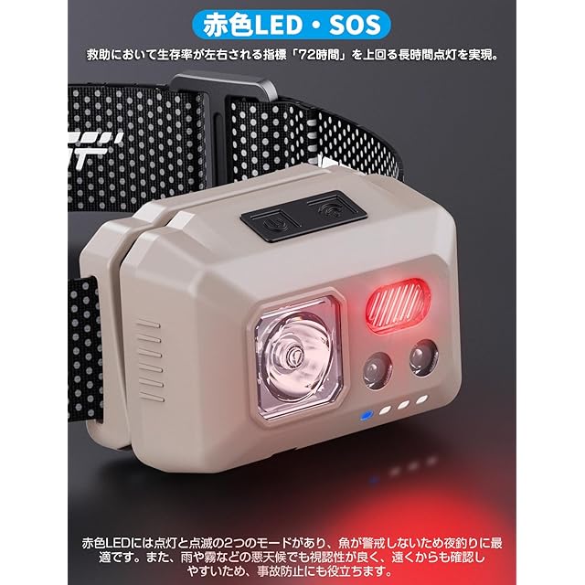 商品名:Tebool ヘッドライト Type-C充電式 大容量1800mAh 高輝度 LED 1000ルーメン 手振りセンサー機能付き 5種点灯モード 赤&白ライト SOS点滅 頭につけ ヘッドランプ 防水防塵 60°角度調整可 夜釣り 最適 登山 キャンプ 散歩 作業 釣り アウトドア 災害 停電用 小型 超軽量 ヘッド ライト