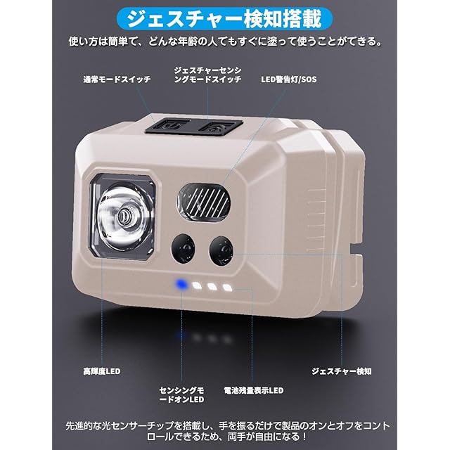 【手を振ることで作動するモーション】内蔵チップは、あなたの指示を感知して、いつでもオン・オフを切り替えることができ、両手を照明のために解放することができる。快適で調節可能なヘッドバンドが付属しているので、ヘッドランプを使えば、仕事、冒険、遊びに両手を自由に使える。