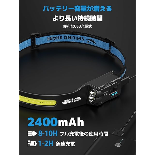 商品名:Smiling Shark ヘッドライト TD-0123-S 【2つの集光ライト・幅広い照射範囲】Type-C充電式 高輝度 LEDヘッドランプ 強力 5つ照明モード 点滅 270°以上広角照明 人感センサー付き 8時間連続使用可能 IPX4 防水防塵 多機能 釣り 登山 散歩 キャンプ 作業 災害 停電 最適 二個入り