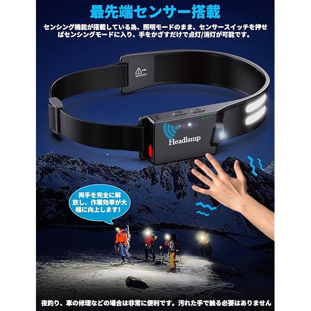 【手を振ることで作動するモーション】内蔵チップは、あなたの指示を感知して、いつでもオン・オフを切り替えることができ、両手を照明のために解放することができる。快適で調節可能なヘッドバンドが付属しているので、ヘッドランプを使えば、仕事、冒険、遊びに両手を自由に使える。