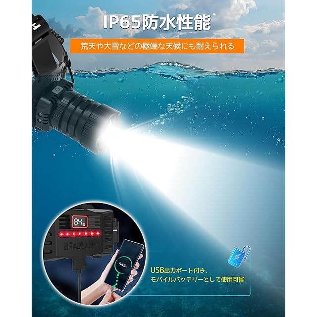【超高輝度 LED ヘッドランプ】最強の輝度は100000ルーメンです.(絶対目で直視しないでください!)ヘッドライトはP50高輝度ライトビーズを搭載し、従来の正方形のランプビードは円形のランプビードにアップグレードし、影なしで集中し、より明るく、より遠くまで、より安定した照明を実現しました。無段階ズーム機能付き、ランプヘッドを伸縮して、焦点距離を変更します。集光モードで5000メートルまでの対象物に焦点を合わせることができます。プラスチック製の他のヘッドランプに比べ、弊社のアルミ合金製は見た目がおしゃれで格好いいだけでなく、放熱が早いので夏でも本体が熱くなりません!電池残量をデジタル表示し、いつでも一目で電池状態を監視でき、運転中の突然の停電を効果的に回避できます。弊社のヘッドランプは、お客様が必要とする多くの機能を搭載し、コスパに優れています!