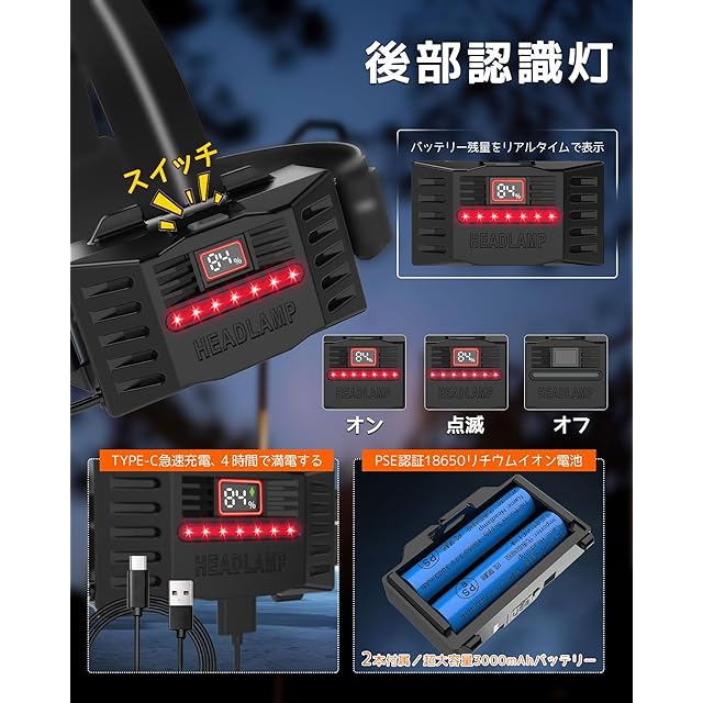 【Type-C急速充電】充電式ヘッドランプはType-C充電ポート設計を採用し、より効率的で安全な充電が実現、僅か4時間で完全充電となります。2本の充電可能な18650 バッテリーが付属しており、バッテリーはPSE認証を取得し、安全で信頼性が高く、過充電保護と過放電保護を備えており、繰り返し充電して使用できます。長時間装着する際に重さが気になる場合は1本のバッテリーを取り出して軽量になり、明るさは変わりません!バッテリー残量をリアルタイムで表示、より使いやすい、充電中:赤色指示灯点灯、充電完了:緑色指示灯点灯。バッテリーコンパートメントはUSB出力ポート付き、モバイルバッテリーとして使用可能、万が一台風や地震などに遭った場合、このヘッドライトは安全な避難に役立ちます。