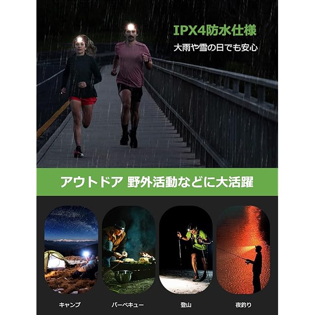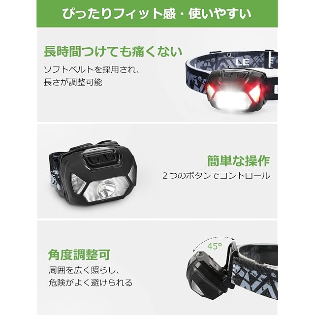 明るさは300ルーメン、照射距離最大約150メートル。この明るさなら夜の散歩や暗い場所での活動に大活躍!地震、災害や突然停電した時にも役立ちます。ヘッドライトの先端は照射角度(45度まで)調整ができますので、足元だけではなく、照射周囲を広く照らし、危険がよく避けられます。ヘッドライトは電池交換不要、経済的で省エネ。満充電で、約4~30時間の連続点灯ができます。IPX4防水仕様で、大雨、地震、停電など万が一の時に防災用品としても十分にお使いいただけます。集光モードでHighは4時間、Lowモードは12時間点灯;散光モードでHighは10時間、Lowモードは30時間点灯;赤LEDモードで赤色点灯とSOS赤緑点滅は15時間点灯。赤色灯は魚が警戒せず、夜釣りには最適です。雨・霧などの悪天候でも視認性が良く、遠くからでも確認しやすくなり、事故防止に役立ちます。ヘッドライト本体の重さは約55gと非常に軽量です。また、ソフトベルトを採用され、夜釣りなどの場合は長時間装着しても首にストレスを与えません。登山、釣り、キャンプ、ハイキングや自動車整備などでのアウトドア活動に活躍します。CEとROHS認証済みです。