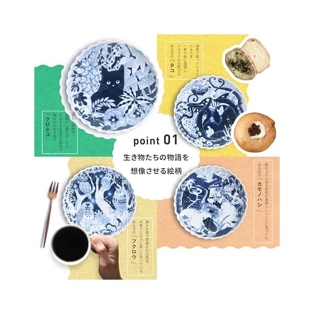 細やかな線で描かれたストーリーを感じさせる絵柄。美しくもあり、愛らしさもあり、食卓に置くだけで優しい世界が広がります。