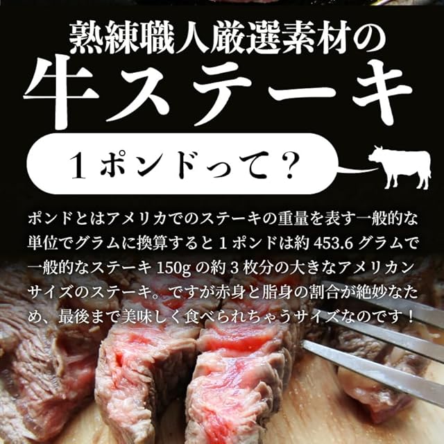 【お召し上がり方】表面にこんがりと色がつく程度に焼いてお召し上がりください。焼きすぎるとお肉が硬くなります。【おいしさの秘密】ポンドとはアメリカでのステーキの重量を表す一般的な単位でグラムに換算すると1ポンドは約453.6グラムで一般的なステーキ150gの約3枚分の大きなアメリカンサイズのステーキ。ですが赤身と脂身の割合が絶妙なため、最後まで美味しく食べられちゃうサイズなのです!