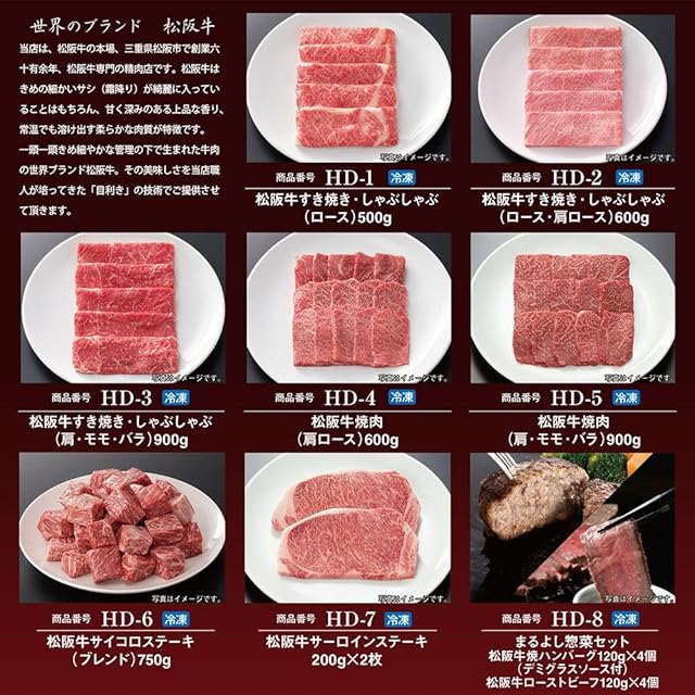 ≪お選びいただける商品≫ HA-1 松阪牛すき焼き・しゃぶしゃぶ(肩・モモ・バラ)150g HA-2 松阪牛焼肉(肩・モモ・バラ)150g HA-3 松阪牛サイコロステーキ(ブレンド)150g HA-4 松阪牛焼ハンバーグ 120g×2個(デミグラスソース付) HA-5 松阪牛ローストビーフ 120g×1個 HA-6 松阪牛しぐれ煮 60g×2個