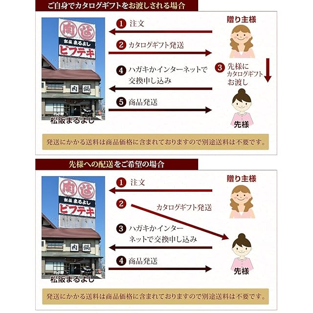 贈られた方がお好みの松阪牛商品(松阪牛すき焼き・松阪牛焼肉・松阪牛ステーキなど)の中から選べるお肉のギフト券が貼り箱に入って届きます。同封の専用注文ハガキをお申込みいただいたお客様宛に、後日松阪まるよしから松阪肉を冷凍でお届けいたします。