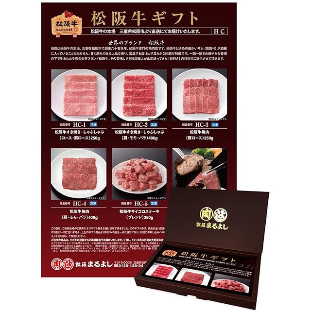 【お選びいただける商品】 ・HC-1 松阪牛すき焼き・しゃぶしゃぶ(ロース・肩ロース)250g ・HC-2 松阪牛すき焼き・しゃぶしゃぶ(肩・モモ・バラ)400g ・HC-3 松阪牛焼肉(肩ロース)250g ・HC-4 松阪牛焼肉(肩・モモ・バラ)400g ・HC-5 松阪牛サイコロステーキ(ブレンド)350g ・HC-6 まるよし惣菜セット 松阪牛焼ハンバーグ120g×2個(デミグラスソース付)松阪牛ローストビーフ120g×2個