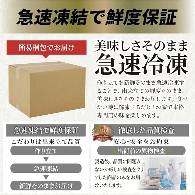 【急速凍結】鮮度そのままの美味しさをお届けするため、-35度の急速凍結で冷凍したお肉は鮮度そのままに出来立ての美味しさをお届けします。 食べたい時に解凍するだけで専門店の味を味わえます。厳しい検査をクリアした商品のみをお届けいたします。