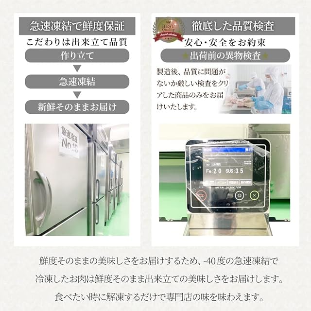 【急速凍結】鮮度そのままの美味しさをお届けするため、-35度の急速凍結で冷凍したお肉は鮮度そのままに出来立ての美味しさをお届けします。 食べたい時に解凍するだけで専門店の味を味わえます。厳しい検査をクリアした商品のみをお届けいたします。