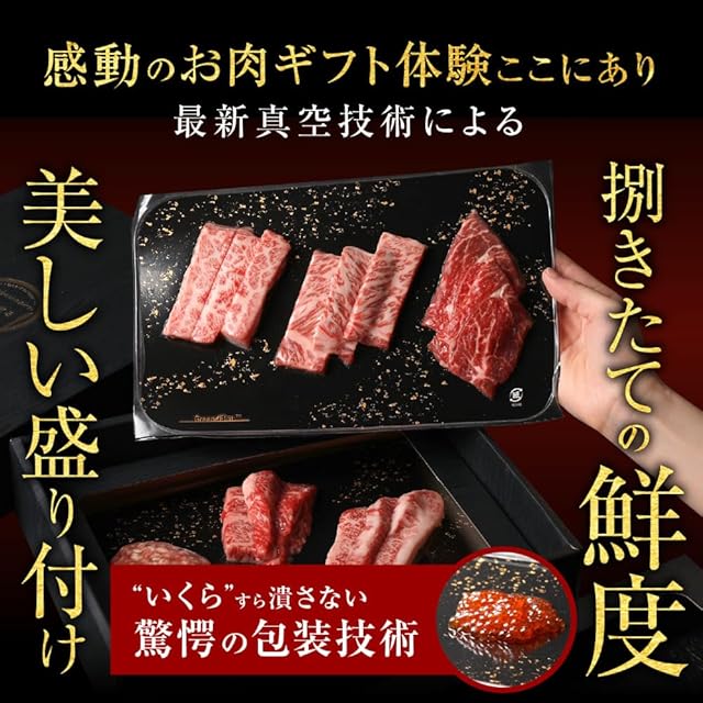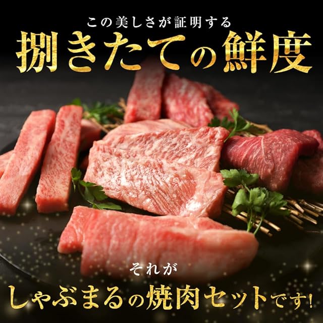【内容量】黒毛和牛クラシタロース45g、モモ45g、カルビ45g、バラ45g、カイノミ45g、黒毛和牛入りハンバーグ150g、ステーキソース×1、焼肉のタレ×2