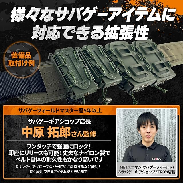 ✅ダンプポーチ、ホルスター、マガジンポーチなど様々なサバゲーアイテムに対応できる拡張性。MOLLE(モール)はもちろんベルトサイズ対応の装備品も取付け可能