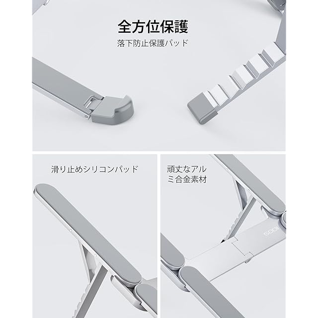 【革新的・極コンパクト】 SODI ノートパソコンスタンド PCスタンド 折りたたみ式 安定感 超軽量 角度調整 腰痛 猫背 姿勢改善 おしゃれ laptop stand パソコン台 卓上 持ち運び 外出 自宅 10-16インチ 収納ポーチ 日本語取扱説明書