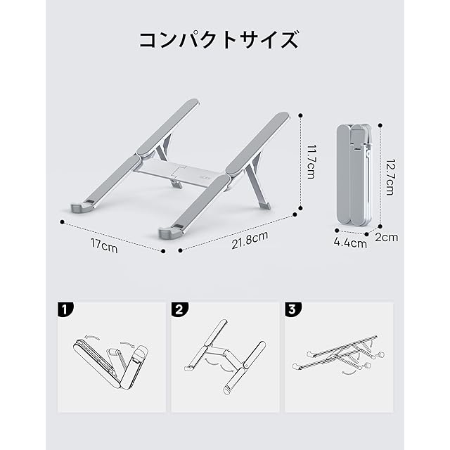 このノートPCスタンドの本体は耐久性と頑丈さに優れたアルミニウム合金で作られています。パソコンと接触する部分は高品質なシリコン素材で覆われており、滑り止め性に優れているだけでなく、パソコンを損傷から守ります。また、シンプルな構造とPCとの接触面積の極度の圧縮により、放熱・冷却効果も非常に優れています。6 段階の高さレベル (45 mm~120mm)と15~30 度の傾斜角度を実現します。人間工学に基づいた設計で、腰痛や猫背のやわらかに役立ちます。折りたたむとわずか127×44×21mmとなり、スマートフォンよりも小さくなります。手のひらに入ってしまう程のコンパクトさ、これならどこへでも持ち歩けます。図書館、カフェ、オフィス、自宅でも快適に使用できます。支え部分はスプリング設計を採用しており、ワンタッチで角度を固定できます。揺れずに角度調整もできるのでとても便利です。安定性も抜群で、強くタイピングしても揺れません。