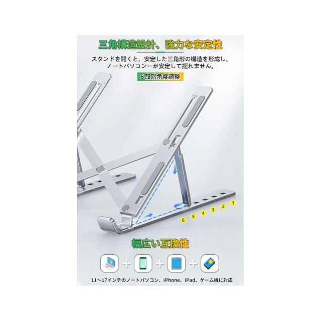 【人間工学設計&6段階高さ調節可能】ノートパソコンスタンドは人間工学デザインにより、視線が高くなり適正な姿勢に、肩や腰や首など負担を軽減してくれて、猫背などを有効に防止できます。長時間のノートパソコン作業時に傾斜角度約15°~45°の6段階を調整可能、自身に合わせて最適な姿勢で気楽に仕事場を作り、デスクワークがもっと快適になります。注意:パソコンスタンドを最大の角度まで伸ばしてから使用します。