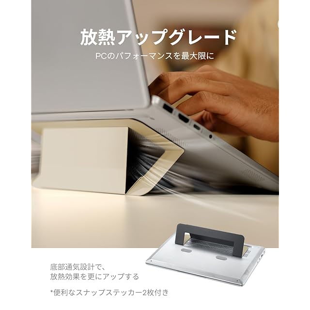【シンプルで効率的・変わらぬサポート】特殊なPU素材を使用し、思い通りに動く折りたたみ式デザインを採用し、軽量・小型・薄型でありながら、最大耐荷重5kgの日常使いのできるパソコンスタンドです。 *ご注意:パソコンスタンドをご使用の際、キーボードの周りを叩くとパソコンが揺れるという意見を頂きました。この件について、実際に使用した場合を検討し、作業時両手を自然にキーボード上に置くと揺れることはないのでご安心ください。