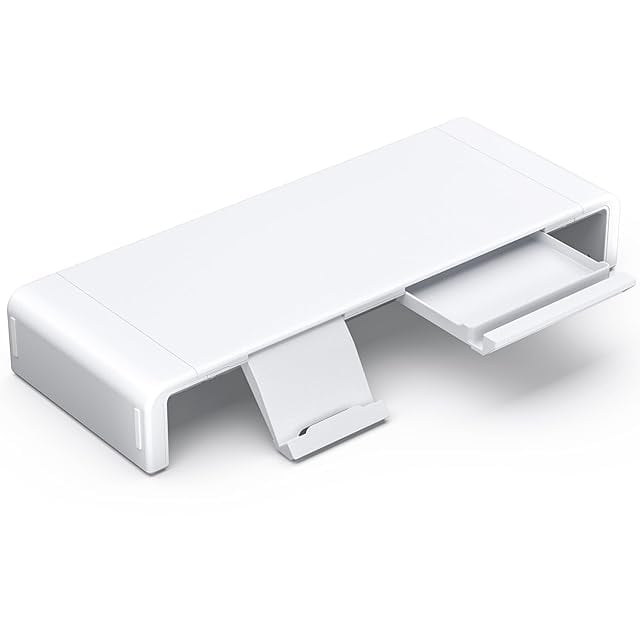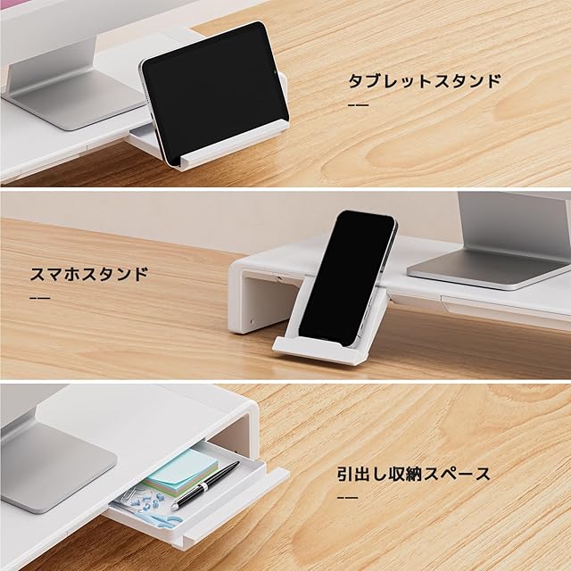 Klearlook モニター台 机上台 耐荷重50kg 折りたたみ式 三段階の幅調整可能 ノートパソコンスタンド モニタースタンド デスクスタンド キーボード収納 引き出し スマホ・タブレットトレー -ホワイト<br>モニターだい 台 パソコンだい 台 卓上 モニター台 デスク 台<br>卓上台 モニターラック 50cm スタンど モニター置き台 台座 テレビ台 モニターテーブル パソコンだい パソコンスタンド ノートパソコン パソコンラック monitor stand 引き出し付き pcラック ディスプレイスタンド パソコンモニタースタンド 黒 pc台 モニター置く台 ディスプレイ モニター代 ディスプレイ台 モニターだい テーブル ディスプレイ用台 収納 pcモニタースタンド ラック 奥行き20cm pc 机 リヒトラブ モニター用 ディスフレイ モニター台座 ノートパソコン台