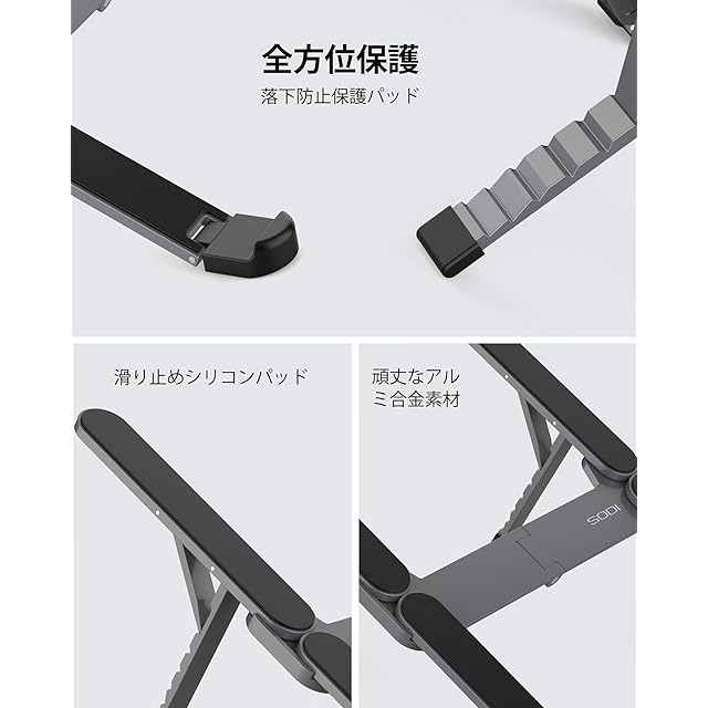 【革新的・極コンパクト】 SODI ノートパソコンスタンド PCスタンド 折りたたみ式 安定感 超軽量 角度調整 姿勢改善 おしゃれ laptop stand パソコン台 卓上 持ち運び 外出 自宅 10-16インチ 収納ポーチ 日本語取扱説明書