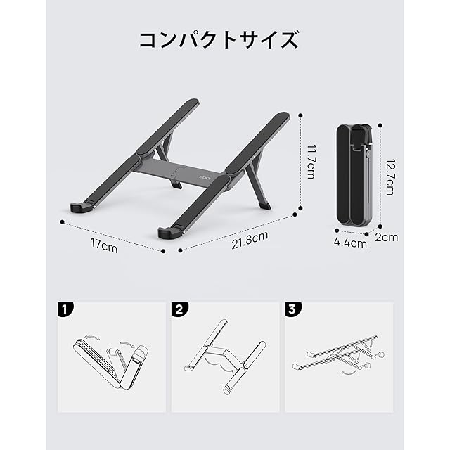 このノートPCスタンドの本体は耐久性と頑丈さに優れたアルミニウム合金で作られています。パソコンと接触する部分は高品質なシリコン素材で覆われており、滑り止め性に優れているだけでなく、パソコンを損傷から守ります。また、シンプルな構造とPCとの接触面積の極度の圧縮により、放熱・冷却効果も非常に優れています。6 段階の高さレベル (45 mm~120mm)と15~30 度の傾斜角度を実現します。人間工学に基づいた設計で、腰痛や猫背のやわらかに役立ちます。折りたたむとわずか127×44×21mmとなり、スマートフォンよりも小さくなります。手のひらに入ってしまう程のコンパクトさ、これならどこへでも持ち歩けます。図書館、カフェ、オフィス、自宅でも快適に使用できます。支え部分はスプリング設計を採用しており、ワンタッチで角度を固定できます。揺れずに角度調整もできるのでとても便利です。安定性も抜群で、強くタイピングしても揺れません。
