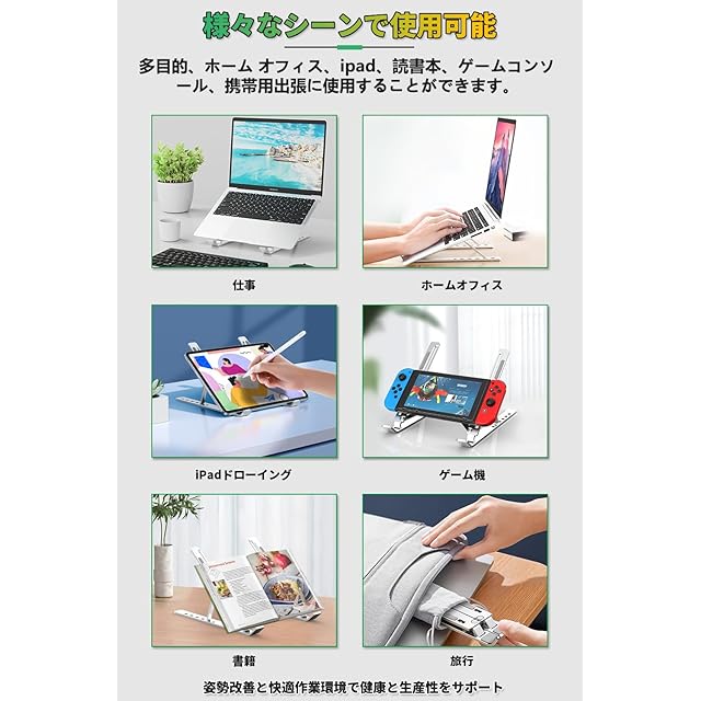 【優れた放熱性】ノートパソコンスタンドは熱伝導率の高いアルミ合金とシリコン素材で作られています、特別な中空設計により、放熱面積が最大限度に広げて、冷却スタンドとして放熱性も非常に良いです。熱い日にタブレットやノートパソコンを使いて長時間のテレワーク時に放熱重宝です。